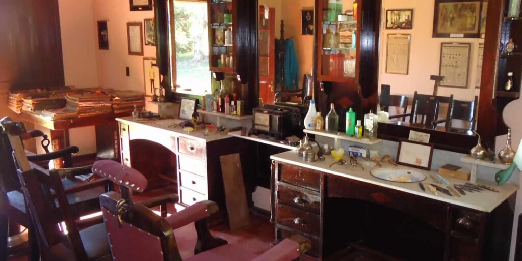 Uma antiga barbearia instalada no centro da cidade de Palmeira foi reconstituída no Sítio Minguinho, com objetos e utensílios originais.