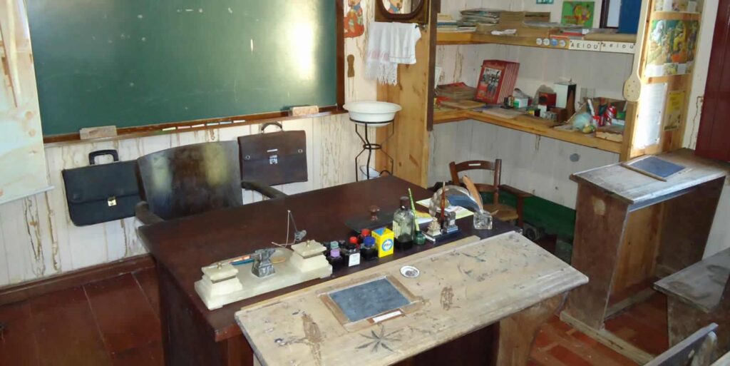 Do tempo em que se utilizava caneta-tinteiro, mata-borrão e réguas de madeira, quando a temida palmatória impunha a disciplina na classe, uma sala de aula típica das primeiras décadas do século XX exibe móveis de época, como as carteiras duplas, além das lousas individuais, livros e materiais utilizados por alunos da classe multisseriada.