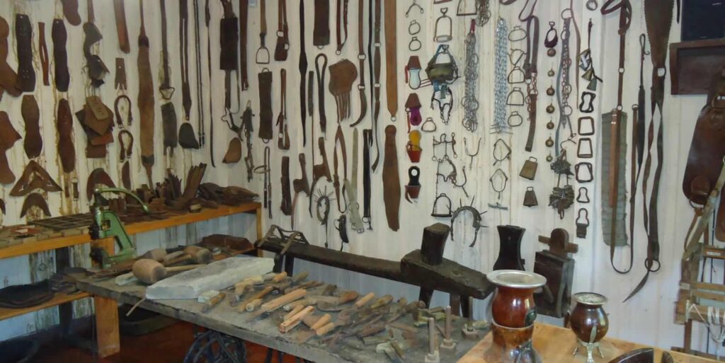 A habilidade do seleiro em produzir artefatos de couro fez desse ofício um dos mais respeitados. Aprecie cada ferramenta e a grande variedade de ilhoses empregados na confecção de arreios, calçados, cintos…